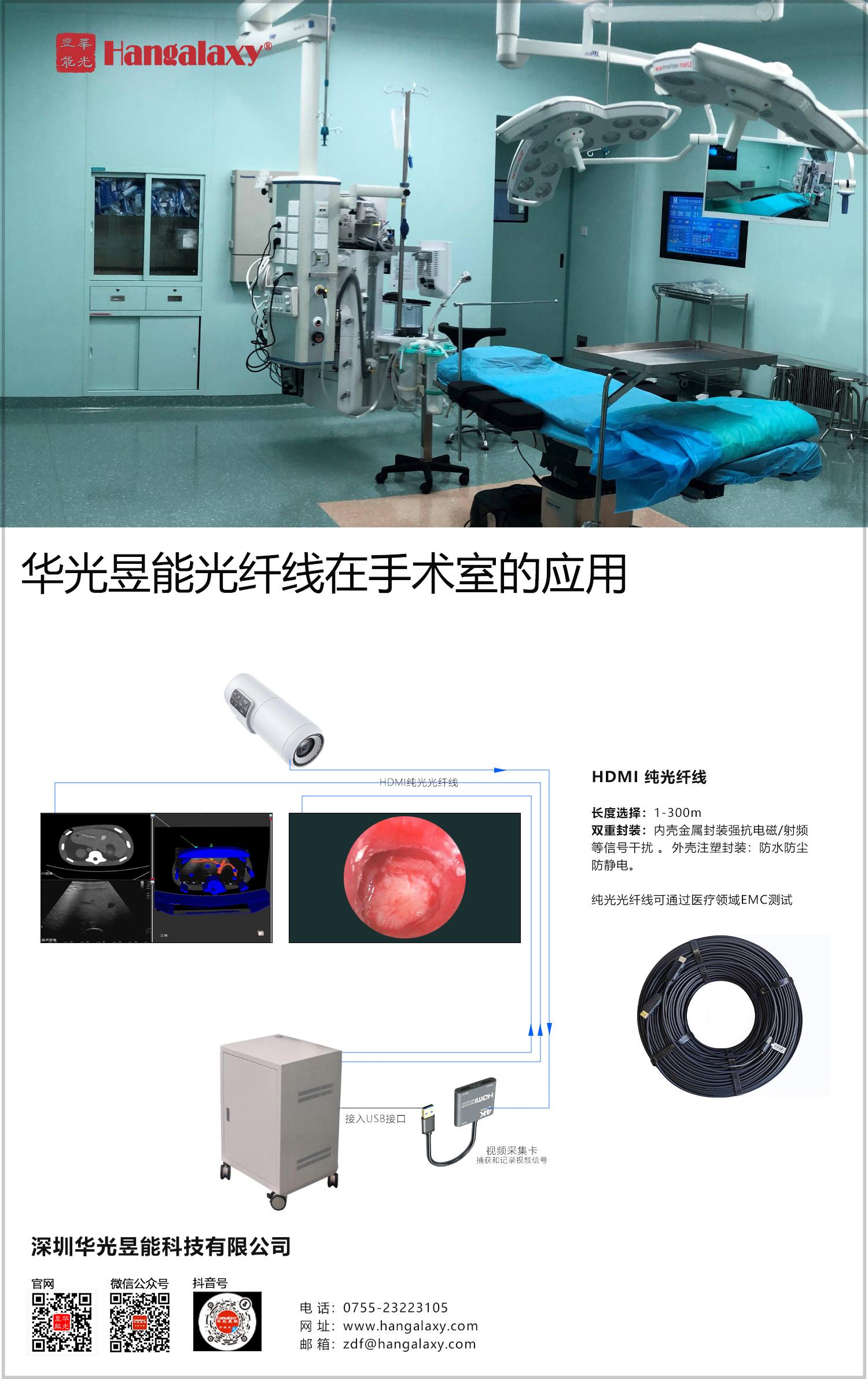 在科技浪潮的席卷下,医疗技术正以前所未有的速度蓬勃发展,光纤技术更是如同一颗璀璨的新星,在现代医疗设备的舞台上熠熠生辉,成为其中不可或缺的重要组成部分。而DP AOC/HDMI AOC/USB Type-C AOC有源光纤线(Hangalaxy 4K有源光纤线,Hangalaxy 8K有源光纤线,华光昱能Hangalaxy医疗光纤线,专业工程光纤线),凭借其融合的先进软件与芯片技术,宛如一阵强劲的东风,为医疗行业带来了堪称革命性的巨大变革。