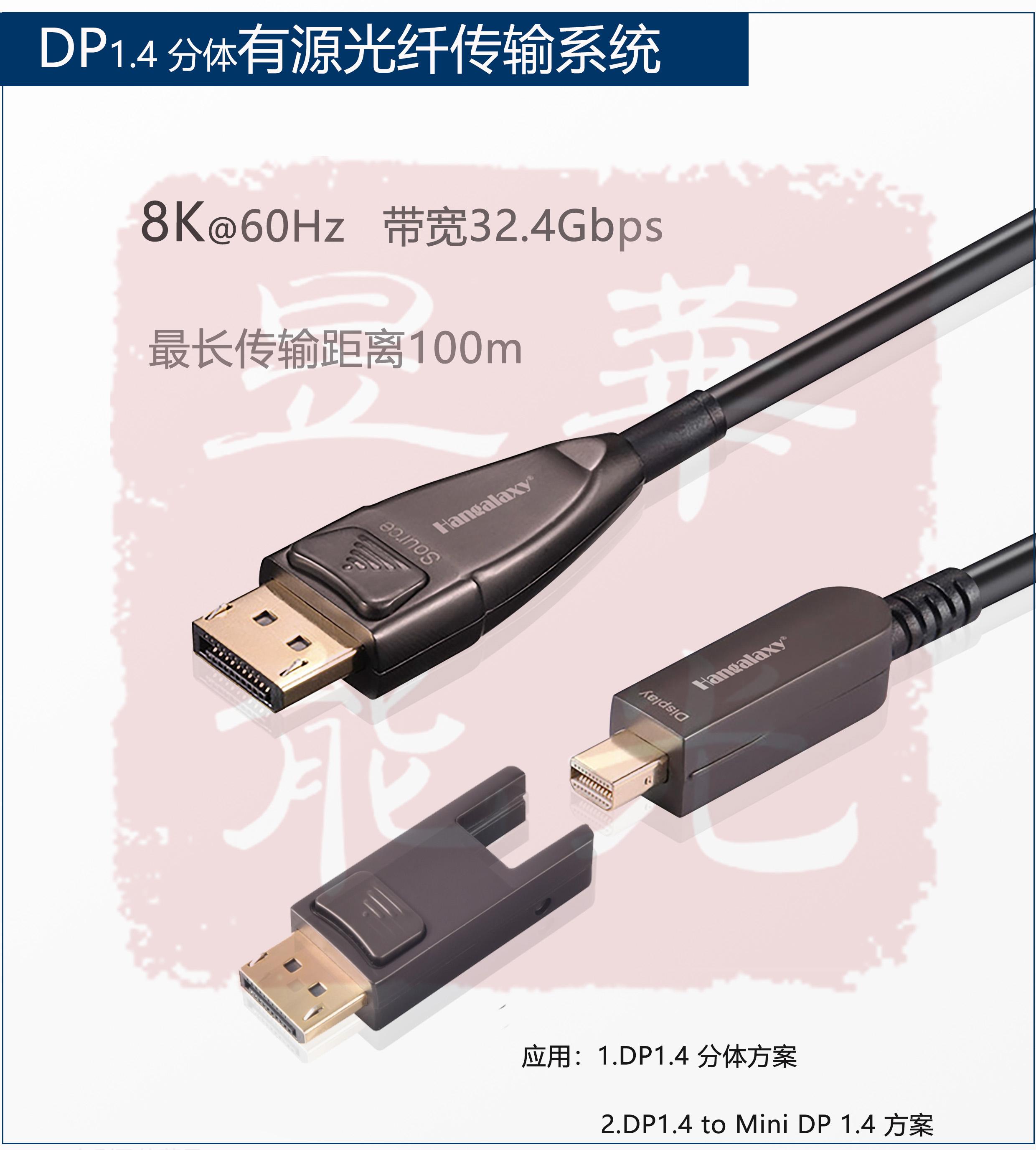 华光昱能Hangalaxy 4K 8K HDMI AOC/DP AOC专业工程有源光纤线分体方案最长传输距离100米,有两种选择方式:一种是source和display两端都是Mini头+A型头;另一种是source端为标准A型头,display端是Mini头+A型头。Mini头可以穿1.5/2.0管,穿管后连接主设备时Mini头插上A型头实现即插即用。